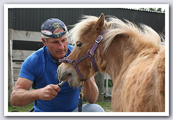Here a newly arrived mini's teeth are being rasped by equine dentist Julian Sparks.