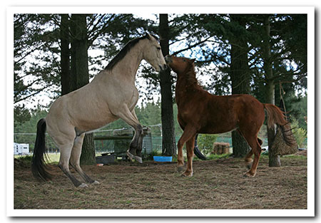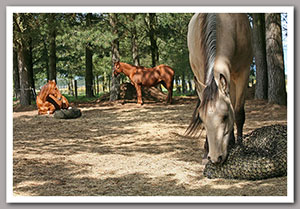 Cathy Dee's Dry Lot is roomy enough for the horses to bounce about in. It is situated under large pine trees so the horses have shade and shelter and places to go to get away from each other. The upshot is that they love it in there!