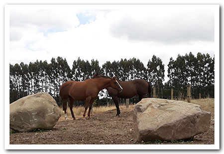The girls hang out by the scratching stones on the CalmHealthyHorses track.