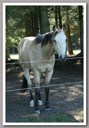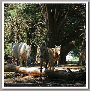 Cathy Dee's Dry Lot is roomy enough for the horses to bounce about in. It is situated under large pine trees so the horses have shade and shelter and places to go to get away from each other. The upshot is that they love it in there!